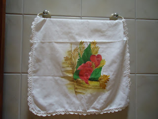 | Pano de copa pintado com barrinha de crochê. |